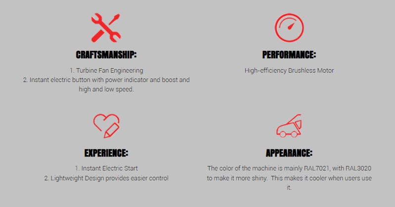 تصميم شفرة المروحة: يضمن التصميم الديناميكي الهوائي لشفرة المروحة توجيهًا فعالاً لتدفق الهواء، ويزيد من قوة نفخ الأوراق، ويحسن تأثير التنظيف.