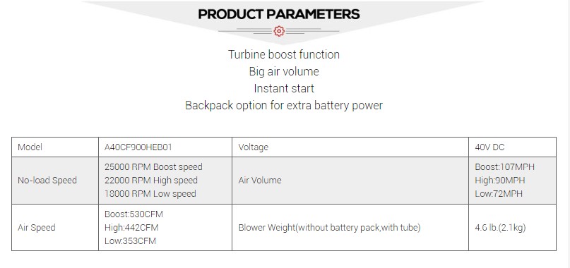 تقنية المحرك بدون فرش: تعتمد وظيفة الشاحن التوربيني لمنفاخ أوراق بطارية الليثيوم على تقنية محرك بدون فرش فعالة، والتي تدفع المروحة التوربينية بسرعة عالية لتوليد تدفق هواء قوي.