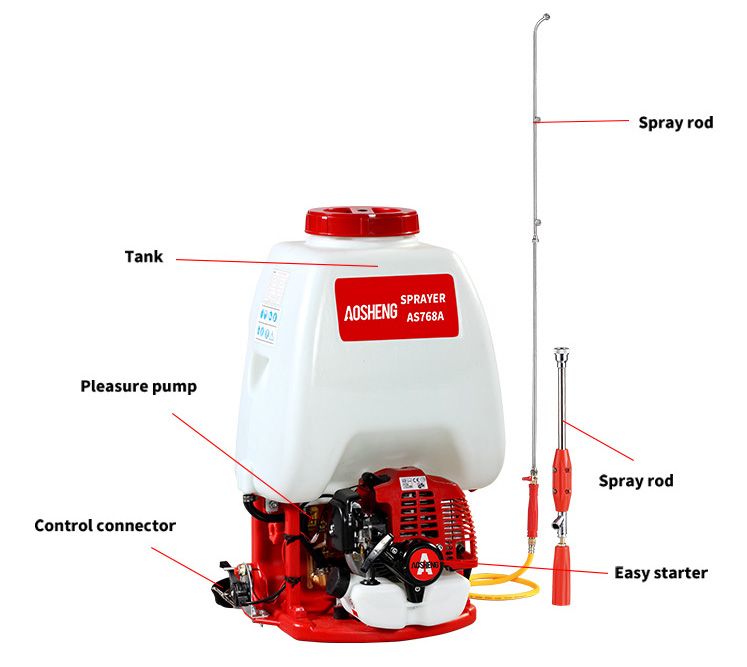 محرك عالي الأداء مع ملحقات عالية الجودة. مضخة ضغط المواد النحاسية، مقاومة للتآكل. تأثير الانحلال العالي. يستخدم في الزراعة والوقاية من الأوبئة والتطهير.